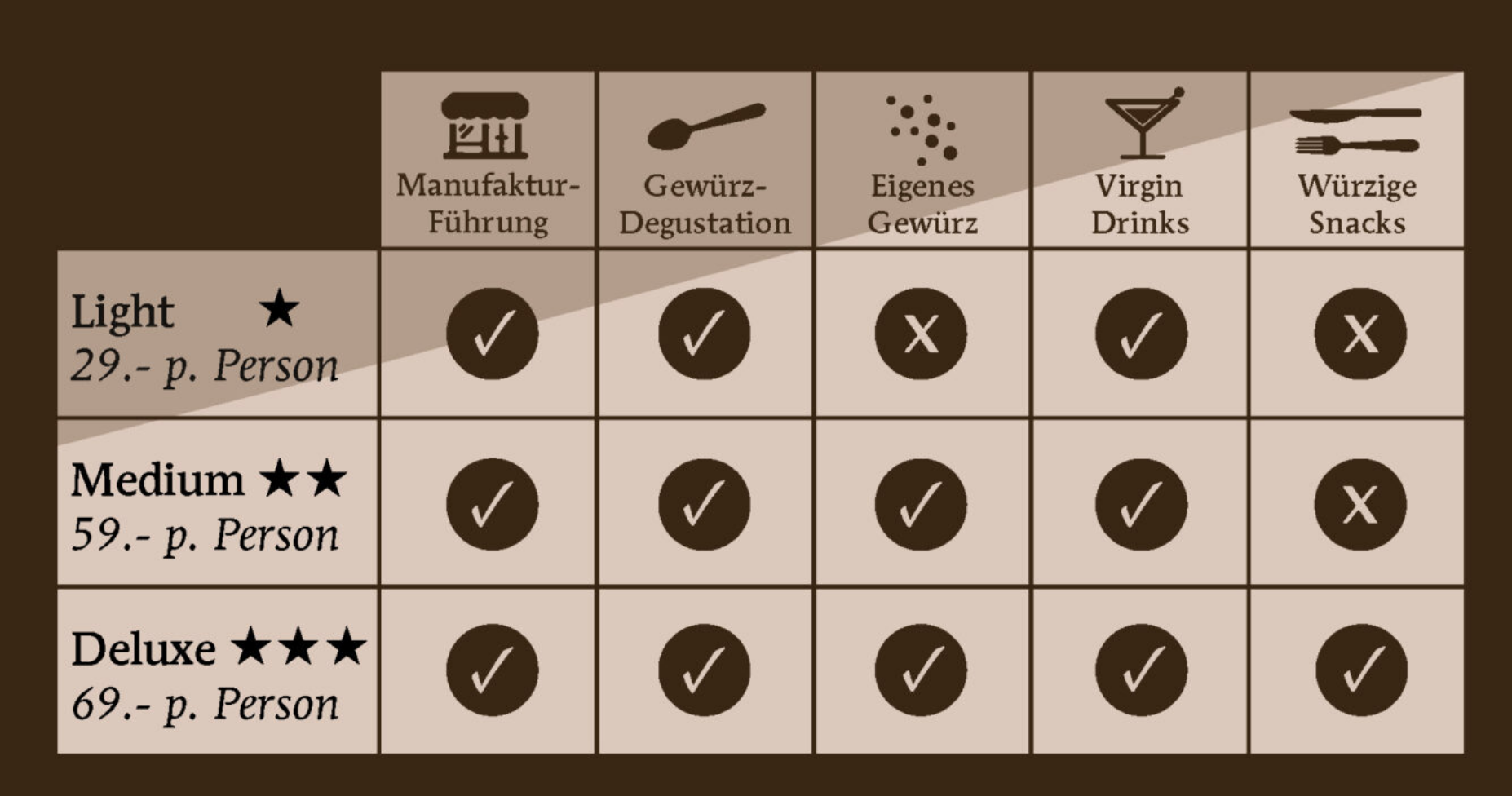 In der Deluxe-Variante werdet ihr auch selber aktiv und dürft euer eigenes Gewürz-Salz unter Anleitung und mit fachmännischer Unterstützung herstellen und in einer edlen Metalldose mit nach Hause nehmen. Dazu kommt die Führung durch die verschiedenen Räume der Manufaktur und Gewürzlager, Einblick in unsere Entstehungsgeschichte und soziales Engagement, Gewürz-Degustation